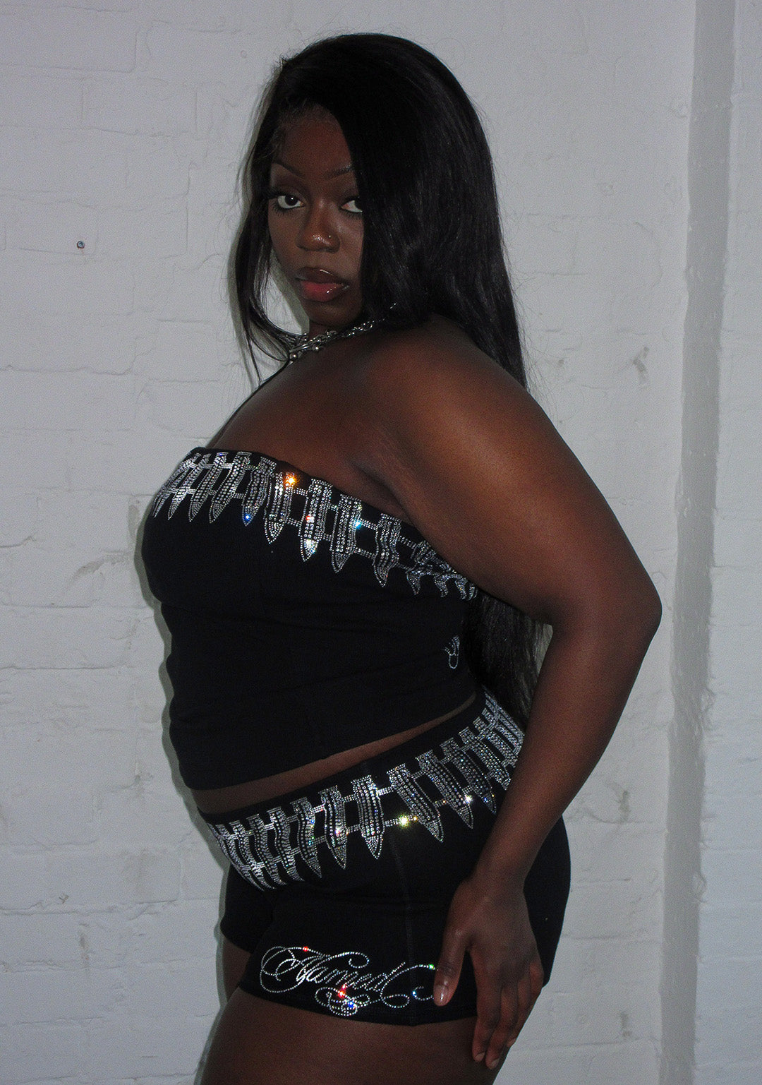 ★ Embellished with 360° multi-size rhinestone logo and bullet design